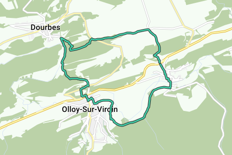 Ausgangspunkt ist der Place Albert 1. Verlasse den Platz und nimm die schräg links verlaufende Straße (Roche Madoux) nach oben. An Nr. 14 verlässt du den befestigten Weg. Gehe geradeaus und folge diesem schmalen Pfad bis zu einer stark befahrenen Straße. Achte beim Überqueren auf den Verkehr. Auf der anderen Seite rechts abbiegen entlang des Containerparks und einiger Lagerhäuser. Nach dem letzten Gebäude links abbiegen. Steigende Asphaltstraße, Chemin du Transoy. Ignoriere die Seitenstraße nach links. Der Weg macht eine rechtwinklige Kurve nach rechts. Auf Höhe eines GSM-Mastes gelangst du wieder ins Freie. Gehe geradeaus in Richtung einer neuen Waldpartie. An der Kreuzung (mit Schild max. Breite 8 m) links abbiegen. Folge diesem Weg eine ganze Zeit lang. An der Gabelung (mit Schild RAVeL L156) geradeaus, sanft abwärts. Ein Stück weiter an einem Holzpfahl links in den Wald (Kennzeichnung blau-weiß-blau). Ignoriere alle Seitenwege und gehe, leicht abwärts, weiter in Richtung Viroinvallei. Du erreichst den Punkt La Haute Roche, von wo aus du einen schönen Blick auf das Dorf Dourbes hast. Folge der blau-weiß-blauen Kennzeichnung. Nach einem steilen Abschnitt erreichst du wieder die Straße. Links abbiegen. Folge der Straße in Richtung Picknickplatz, wo du zum ersten Mal einen Blick auf den Viroin hast. Gehe weiter entlang des Flusses und nach einer Weile führt der Weg vom Viroin weg. An der nächsten Gabelung links halten. Am Steinkreuz geradeaus. Ein Stück weiter an einer kleinen Kreuzung, an einem Pfahl und einem Baum mit Markierungen, links abbiegen. Gehe geradeaus (gelbes Raute). Du kommst in freies Gelände, wo der Weg nach rechts abbiegt. An der T-Kreuzung (einzelstehendes Haus) rechts abbiegen. Nach zwei Briefkästen links abbiegen (gelbes Raute). Du steigst schnell nach Olloy-sur-Viroin ab. Überquere die stark befahrene Straße und über eine Brücke betrittst du Olloy. Gleich nach der Brücke links abbiegen. An der zweiten Seitenstraße rechts abbiegen, Rue de l’ancienne Mairie. An der T-Kreuzung beim Kapellchen links abbiegen. An der nächsten T-Kreuzung wieder links abbiegen. Vorbei am Friedhof. An einem Picknickplatz macht die Straße eine rechtwinklige Kurve und steigt nach rechts an. Du überquerst eine alte Eisenbahnlinie und an der Gabelung weiter links abbiegen. Folge von nun an den rot-gelben Markierungen, so bleibst du stets beim Viroin. Nach einem schönen Blick auf das Schloss biegst du an der Straße links ab. An der nächsten Gabelung links nach oben. Bei Nr. 21 die Treppe links nach oben und so zum Ausgangspunkt.