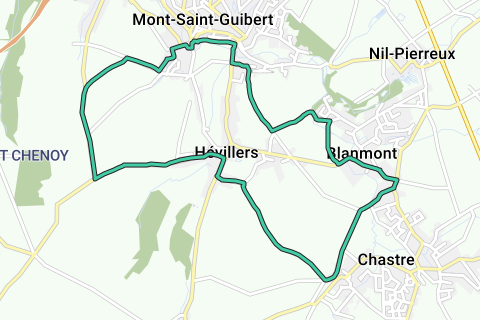 Startpunkt an der Kirche Saint-Guibert (Grand Place) (V). Gehe hinunter und nimm links (Rue de la Fosse). Nach 150 m erreichst du den Place des Martyrs (Parkplatz!), biege rechts ab und folge der Kurve, dann rechts entlang des langsamen Weges. Dieser mündet in die Rue des Tilleuls, rechts abbiegen und über die plätschernde Orne gehen. Auf der gegenüberliegenden Straßenseite befindet sich das Café des Pêcheurs (kostenloser Parkplatz entlang der langen Mauer). Biege dann die erste links ab, Rue de Bayau. Nach ein paar hundert Metern rechts in den Chemin Tollet abbiegen. Kurz darauf gibt es eine Schranke (Weg ist verkehrsfrei), gehe weiter rechts. Nach ca. 850 m folgt wieder eine Schranke, dann gleich links in den Chemin du Moulin Al Poudre. Nach ca. 800 m unter einer Eisenbahnbrücke, biege rechts ab (Rue du Gros Chêne), über Kopfsteinpflaster (Domaine al Poudre), am Ende des Teiches an X rechts der unbefestigten route des Carrières folgen. Nach 700 m erreichst du den Bahnhof von Chastre, bieg links ab (NICHT über die Gleise!) und folge der Rue de la Gare, du kannst hier links in die Rue de l’Église hin und her bis zur Kirche von Blanmont (1) gehen, die Rue de la Gare wird zur Rue du Château und weiter zur Rue des Combattants. An X rechts in Richtung ‘Chastre 2’, nach gut 100 m rechts die Rue de la Fontaine nehmen. Unter der Eisenbahnbrücke und an der Y-Gabelung (weißgekalkte Kapelle) links der Rue de la Chapelle folgen. Nach ca. 1 km Y-Gabelung, an einem Bauernhof rechts (noch Rue de la Chapelle) und dann nach 200 m an X ganz rechts (bei dem Hof Van Bellingen), einem Feldweg (der zur Betonstraße wird) etwa 1,2 km folgen. Dann links die Rue du Colombier, vorbei am Friedhof und nach 300 m rechts (Kapelle gegenüber) Rue de la Houssière. Kurz darauf siehst du die Kirche von Hévillers (2), hierfür links und nochmals links die Rue du Chenoy nehmen und ca. 1,6 km folgen. Vorbei am orangen Erdgasschild rechts der belebteren Rue de Bierbais (wird zur Rue Vital Casse) folgen. An einem Stück Wald und in der Kurve (mit einem kleinen Baum rechts weiter hinten) den Weg verlassen rechts und schmal überwohntes Feldweg 600 m folgen. Bis du nach der Schranke die Rue de Nivelles erreichst. Hier rechts. Alternativ: weiter Vital Casse folgen und nach 600 m rechts die Rue de Nivelles ein Stück folgen. Dann links die Rue de l’Ornoy ca. 500 m folgen (immer den Kurven folgen). An der Y-Gabelung (mit einem großen Gebäude rechts) rechts (immer Rue de l’Ornoy, die dann schnell zur Rue des Hayeffes wird), weiterhin entlang des Betriebsgebäudes. Am Ende erreichst du den Place du Peuple und links gelangst du zurück zum Startpunkt.