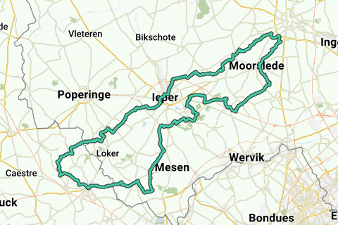 Die Fahrt führt dich durch sanfte Landschaften im Provinzgebiet Palingbeek nach Wijtschate, Wulvergem und über Nieuwkerke in Richtung des schönen Bailleul. Von hier aus fahren wir ein Stück durch Frankreich in Richtung Berthen und dann zurück nach Belgien über Westouter nach Ieper über das Schlachtfeld von Passendale mit dem Kanada-Berg als letzte Herausforderung zurück nach Roeselare.