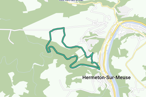 Start auf dem Place Gustave Champt in Hermeton-sur-Meuse (V). Überquere die Brücke über den Hermeton vorbei am durchgestrichenen Schild ‘Hermeton-sur-Meuse’ und biege links bei Nr. 64 ab. Sofort ansteigender Weg rechts. Folge diesem Weg (mit Kopfsteinpflaster) neben einem weißen Haus. Du erreichst einen breiteren Weg (Markierungen mit grünem Rhombus und gelb-roten Zeichen). Ignoriere den Seitenweg rechts und gehe weiter ansteigend. Du kommst an einem Wasserreservoir (1) vorbei. Weiterhin biegt der Weg stark nach rechts im Wald ab. Du folgst hier weiterhin den Markierungen mit dem grünen Rhombus. Nach einer Weile geht der Weg 180° nach links. Weiter folgen, sanft ansteigend nach oben. Ein Stück weiter, offenes Gelände mit schönem Blick auf Hastière und die Maas. Vorbei an einigen Ferienhäusern und Wohnwagen auf der rechten Seite. An einer Kreuzung ignoriere den Weg nach links. Folge dem Weg entlang der Hintergärten der Ferienhäuser. An einer Kreuzung, mit rechts einem asphaltierten Weg, bleibst du geradeaus auf dem Feldweg (unter den Stromleitungen hindurch). Bald hast du einen schönen Ausblick rechts. Du kommst zu einem asphaltierten Weg, den du rechts folgst. Ein Stück weiter, an der T-Kreuzung, links zwischen einigen Wochenendhäuschen hindurch. An der nächsten Kreuzung (in Höhe von Nr. 67-68) geradeaus auf dem Kiesweg. Dies ist die Allée des Bergeronnettes (2). Du gelangst in offenes Wiesenland. Der Weg biegt recht scharf nach rechts. An einer Kreuzung mit befestigten Schotterwegen geradeaus. Vorbei an einem Wochenendhaus, das in Verfall gerät, erreichst du eine Straße. Links. Gehe erneut an einigen Wochenendhäuschen links und rechts des Weges vorbei. Ein Stück weiter, vor einem Bauernhof mit Ställen, links abbiegen. An einem Holzhaus mit Nr. 9, rechts bleiben. Du gehst jetzt zwischen Stacheldraht und einer Hecke. Ein Stück weiter links abbiegen. Folge dem gewundenen Weg, mit links Wald und rechts Wiese. Folgt dies bis zur Ecke des Waldes. Dies ist Tienne d’Enfer (3). Von hier folgst du durch den Wald dem weg, der mit blauen Rhombus markiert ist. Es geht nun eine Weile steil nach unten. An einem Querweg links abbiegen. Ein Stück weiter erreichst du zum ersten Mal den Hermeton. Von nun an folgst du die ganze Zeit dem Hermeton, flussabwärts. Manchmal leicht begehbar, manchmal etwas schwierigere Passagen. Auf Höhe der Brücke (4) bleibst du dem Weg entlang des linken Ufers folgen. Über einen breiten Allee erreichst du die alte Blumenmühle von Hastière und damit den Ausgangspunkt.