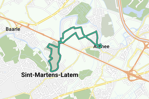 Verlasse mit Blick zur Kirche nach links. An Restaurant Nenuphar links abbiegen. An T RA (Veurestraat). Ignoriere die erste Straße links (Afsneekouter) und nimm die nächste Straße LA (Brilliandstraat). Diese geht über in einen Feldweg. 250 m weiter, an der Kreuzung der Feldwege RA. Du gehst nun quer durch die Afsnee Kouter. An Asphalt gehst du LA. An einer T-Kreuzung kommst du zur Goedingenstraat - RA. Wo die Straße nach rechts abbiegt, nimmst du den Feldweg RD zwischen den Bauernhäusern (Idewallepad). Dieser Feldweg geht bald in einen schmalen Pfad über. Am Ende kommst du erneut zur Goedingenstraat - LA zur Autobahn (E40). Du gehst unter der Autobahn hindurch und nimmst die Treppen auf deiner rechten Seite. Über einen "schwebenden" Fußweg unter der Autobahn überquerst du die Leie. Auf der anderen Seite gehst du die Treppen hinunter und scharf LA. Achtung: Nimm unmittelbar danach den Fußweg links entlang der Leie. Du folgst nun für eine Weile dem schönen Leiepad. Von weitem siehst du den weißen Turm der Kirche von Sint-Martens-Latem auf der anderen Seite der Leie. Nach anderthalb km biegt der Weg von der Leie ab. Am Ende des schmalen Pfades kommst du auf einen Feldweg, den du in dieselbe Richtung (RD) folgst. Ignoriere eine Straße links und folge RD dem schmalen Pfad quer durch die schönen Keuzemeersen (sechseckige Schilder “Afsnee-Keuze Wanderung”). Nach starkem Regen kann es hier ziemlich matschig sein. Achtung: An einer Gabelung nimmst du den Weg RA durch ein Tor