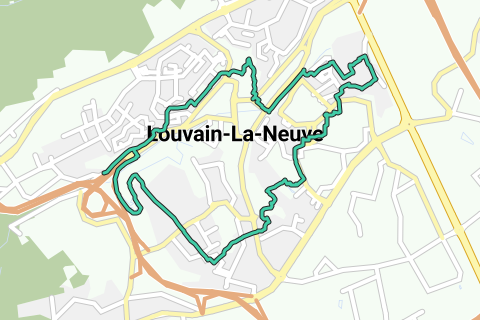 Start an der Rue de Mont-Saint-Guibert 17 (V) und folge dem Weg neben der großen Straße rechts. Bei der Wohnanlage RA Treppen hinunter. Vor dem Tunnel LA, bei der Bank RA und Treppen hinauf. An der Runde RD, Rue de l’Esplanade und RA bis zur Sint-Franciscuskerk (1). Hinter dem Turm RA und LA, Chemin des Sages. An der Kreuzung RD ins Grüne und RA über die kleine Brücke. Vor dir das Hergémuseum (2). LA die Treppe hinunter und RA hinter dem Museum hindurch. RD in den Parc de la Source und bei dem Kiesweg RA. Nach dem Park LA zum Place de l’Université. Rechts vom Platz Rue des Wallons und LA Voie des Hennuyers. Kommst du mit dem Zug (3), steigst du hier ein. An der T LA, bei der Runde RA. Sofort über den Zebrastreifen LA, Treppe hinauf und über die Rue des Tisserands ins Viertel La Baraque. RD ein Sandweg, bei einem Platz RA, Rue de la Baraque. Nach 100 m LA durch die Kleingärten bis zu einem Baum mit drei Bänken. LA, bei den Jurten RA entlang der habitations légères (4) zu einem Erdweg. RA und an der Gabelung RA halten, schmaler Weg neben der Wiese. Am Ende dieser Wiese RA bis zum Verger de la Baraque. Quer über den Platz und RD, Rue du Jardinier. LA, sofort RA und wieder LA, Rue du Poirier. Überqueren, RD und RA um die UCL zu Musée L (5). RA hinter dem Museum, Rue Archimède, über den Place Galilée und RA, Avenue du Jardin Botanique. Bei den Gewächshäusern RA, Kiesweg durch den Park. RA hinter dem Viereckhof und LA am Tennisplatz entlang. Straße überqueren und an der Kreuzung mit der Rue de la Neuville RD in den Wald. Bei der Parkwiese RD dem kurvenreichen Asphalt folgen. Bei den ersten Häusern RA die Treppen hinauf, folgen und bei der T RA. RD die Fußgängerbrücke über, Chemin des Saxophones. Straße überqueren, Treppe hinunter und über den Weg durch die Wiese, links halten. RD, Rue Maurice Grévisse. Bei Notre-Dame d’Espérance (6) RA und nach unten, Parvis de la Cantilène. Von nun an RD, Rue des Poètes und Scavée du Point du Jour, ganz bis zu dem ausgetrockneten See. LA um den See und an der gegenüberliegenden Seite LA durch den Fußgängertunnel. LA zum Ausgangspunkt.
