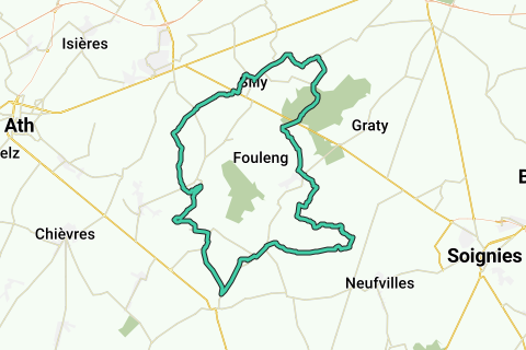 Du fährst an einem Schlossgelände und einem Hof vorbei, wo du frische Eier kaufen kannst. An der ersten T-Kreuzung LA und an der nächsten T RA. An der Abzweigung mit rechts unbefestigt, schräg LA. Du fährst am Bois d’Hérimez und einem Bauernhof vorbei, ignorierst links einen Nebenweg und biegst dann RA in den Chemin du Bonla ein, in Richtung Gibecq. ● Fahre weiter bis zur kleinen Kreuzung mit Knotenpunkt 61. RD in Richtung Knotenpunkt 62. Du rollst am Agglomerationstafel von Gibecq vorbei, ignorierst eine Straße rechts und links und fährst weiter RD. An einer Kapelle folgst du der Straße LA und fährst bis zur Kirche von Gibecq. RA. ● Ignoriere die Nebenstraßen und fahre am Ende der Agglomerationstafel von Gibecq das Dorf wieder hinaus. An der kleinen Kreuzung mit der Ferme d’Hurtebise fährst du RD und setzt deinen Weg über einen hölzernen Weg bis zur N57 fort. RA und dann in die erste Straße LA ein. Dies ist die Rue de Fellignies. ● Folge diesem schönen Weg durch die offene Landschaft. Rechts siehst du schon die Kirche von Silly hinter den Feldern. Du rollst am Agglomerationstafel von Silly vorbei, ignorierst eine Straße links und drehst an der T-Kreuzung RA. Fahre weiter entlang der Taverne de la Sille bis zu Knotenpunkt 62. RA bis zu Knotenpunkt 69 am Ausgangspunkt.