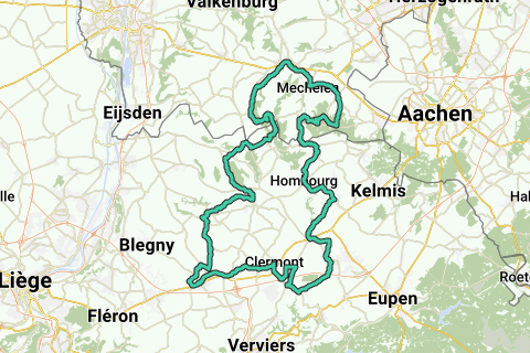 Rundtour Voerstreek 31 von Vijlen. Start/Ziel: Boscafé 't Hijgend Hert, Rugweg, Vijlen. Anstiege: Loorberg Slenaken 1.500 m., max. 8,0%. Magis St. Pieters-Voeren (B) 2.900 m., max. 7,0%. Holliguette Val-Dieu (B) 3.600 m., max. 8,0%. Chaintrain (teilweise Clermont (B) 500 m., max. 6%. Camerig west Vijlen 4.600 m., max. 8,0%. Auf der Route gibt es auch mehrere namenlose Anstiege. Höhenmeter: 1.151. Kaffeepause: Au Point Chaud, Rue de la Clef 74, Hervé (B) (täglich geöffnet).