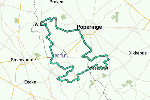 Die Route beginnt am Watouplein und führt über Sint-Jan-ter-Biezen nach Poperinge. Dann fahren Sie in Richtung Den Brabant nach Reningelst, um über die Zoetendaalstraat (eine der schönsten Straßen der Region) nach Westouter abzusteigen. Von Westouter überqueren Sie die Grenze nach Berthen, um von dort aus die Catsberg zu besteigen. Um dann in Richtung Boeschepe zu fahren. Von Boeschepe fahren Sie in Richtung Abele, um über Calcane wieder nach Belgien einzureisen. Über einige schöne und ruhige Straßen kommen Sie zurück nach Watoudorp.