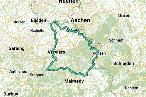 Teuven – Obsinnich – Hombourg – RaVeL 38 bis Plombières – RaVeL 39B bis Kelmis – Hergenrath – Astenet – Hauset – Eynatten – Berlotte – Raeren – Vennbahn – Petergensfeld – Mückenheide (Fahrrad-Knotenpunkte 49-50-51-24) – Vennbahn über Monschau – Küchelscheid bis Sourbrodt-Gare – Robertville (Fahrrad-Knotenpunkte 43-44-55-78-77-54-53-75-74-73) – RaVeL L44A über Cokaifagne – Nivezé bis Spa – Richtung Theux – Marché – Sassor – Fays – Cheval Blanc – Hameau du Bois – Ensival – Francval – Lambermont – Petit-Rechain – Dison – Houlteau – Thimister – RaVeL5 L38 über Froidthier nach Aubel – Hagelstein – Rode Bos – Teuven.