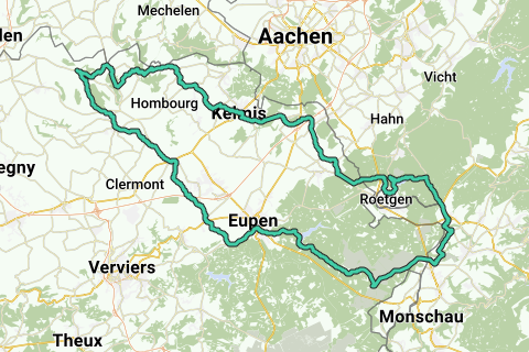 S.M.V. – S.P.V. – Merckhof – Henri-Chapelle – rechts Baelen – Membach – (35) – (39) Eupen (40) – links Lac d’Eupen – rechts entlang des Sees – 41 – 55 – 54 – 53 – 52 – 51 – 24 – Kalltal – Paustenbach – Lammersdorf – Waldsieglung – Rotterdell – Schmithof – Raeren – Lichtenbusch – Hauset – Hergenrath – Kelmis – binnendoor naar Moresnet – Plombières – Sippenaeken – Beusdal – Kloosterhof – Rode Bos – De Plank - S.M.V.