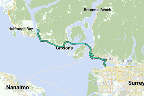 Diese Route bringt dich von der Innenstadt von Vancouver zum Porpoise Bay Provincial Park, auch bekannt als die 'Sunshine Coast', weil dort - durch die Lage von Vancouver Island vor der Küste - oft schönes Wetter herrscht. Achtung: Diese Route enthält eine Fähre (Horseshoe Bay - Langdale), die Überfahrt dauert 40 Minuten.