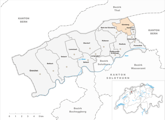 Günsberg liegt auf 624 m ü. M., 6 km nordöstlich des Kantonshauptortes Solothurn , an aussichtsreicher Lage am Südhang der ersten Jurakette, in der Region Unterleberberg, rund 200 m über der Ebene des Solothurner Mittellands.