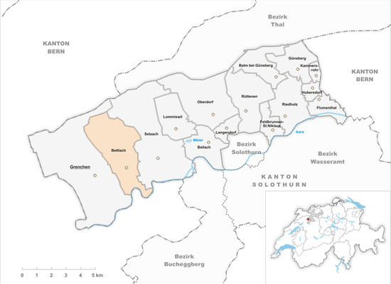 Bettlach ist eine politische Gemeinde im Bezirk Lebern des Kantons Solothurn in der Schweiz. Bettlach besteht aus den Ortsteilen Bettlach Dorf, Allmend, Ried, Büelen, Witi, Bischmatt, Zelg, Bruech, Tannlimatt, Ischlag, Kastels, Burg, Bettlachberg und Bettlachstock.