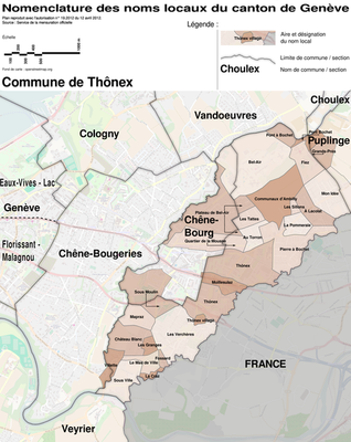 Thônex befindet sich südöstlich von Genf an der französischen Grenze, die hier vom Fluss Foron gebildet wird. Die A411, ein Ast der französischen Autobahn A40 unter anderem von Aix-les-Bains , endet in Thônex.Die Nachbargemeinden sind Puplinge, Choulex, Vandœuvres, Chêne-Bourg, Chêne-Bougeries, Veyrier sowie Ambilly und Gaillard in Frankreich.
