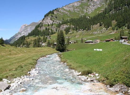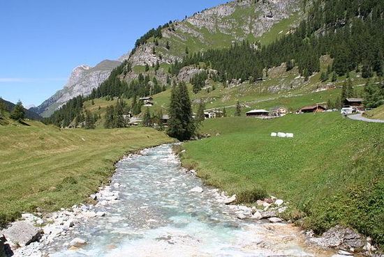 Der Fluss entsteht in Avers durch den Zusammenfluss des Bergalgabaches mit dem etwas kleineren Jufer Rhein, der durch die höchstgelegene Dauersiedlung Europas bekannt ist. In einer tiefen, von der 90 Meter hohen Lezibrücke überspannten Klamm überwindet der Averser Rhein die Talstufe zum tieferen Talboden des von links kommenden, etwas kleineren Madrischer Rhein . Nach dem Zusammenfluss führt er den Namen Ragn da Ferrera , wogegen im deutschen Sprachgebrauch der Name Averser Rhein erhalten bleibt. Ebenfalls von links mündet wenige Kilometer unterhalb der fast ganz auf italienischem Gebiet fliessende Reno di Lei mit grosser, auf Schweizer Gebiet errichteter Staumauer, der den Lago di Lei bildet.