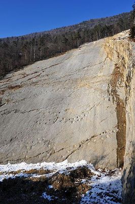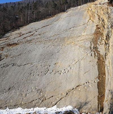Auf der Dinosaurierplatte befinden sich 313 Trittsiegel in neun Fährten. Sichtbar sind die kleineren hufeisenförmigen Abdrücke der Vorderfüsse, etwa 60 Zentimeter lang und 40 Zentimeter breit, sowie die grösseren, ovalen Abdrücke der Hinterfüsse, rund 120 Zentimeter lang und 80 Zentimeter breit. Die Schrittlänge beträgt etwa 2,5 bis 5,2 Meter, was einer Hüfthöhe von 3 bis 4,5 Meter entspricht.