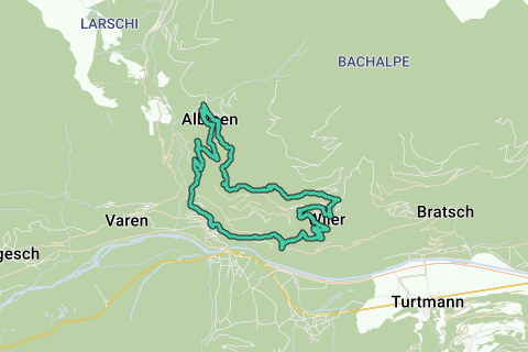 Von Albinen nehmen Sie eine Parallelstrasse, die steil nach Tschingere und St. Barbara führt. Verpassen Sie nicht die Abzweigung nach Leuk, sonst müssen Sie die Fahrt auf der Hauptstraße fortsetzen. Nachdem Sie die Abzweigung genommen haben, durchqueren Sie die Weinberge oberhalb von Leuk. Ab Leuk befindet sich ein kleiner Teil der Strecke an der Hauptstrasse Richtung Erschmatt. Bei Lichten verlassen Sie die Hauptstraße und steigen in Richtung Guttet auf. Nachdem Sie 500 Höhenmeter erreicht haben, können Sie eine Abkürzung nach Guttet Thel nehmen und den letzten Hügel durch den Wald nach Albinen erklimmen.