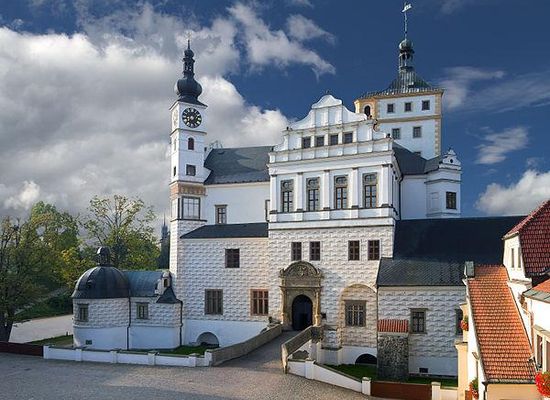 Das Schloss steht an der Stelle eines ursprünglichen Herrensitzes, der wahrscheinlich am Ende des 13. Jahrhunderts angelegt wurde. Im folgenden Jahrhundert wurde dieser in eine Wasserburg umgebaut. Unter der Herrschaft des Wilhelm II. von Pernstein wurde sie im spätgotischen Stil umgebaut und durch einen Ostflügel erweitert. Dessen Sohn Adalbert von Pernstein setzte den Umbau und die Umgestaltung im Frührenaissancestil fort. 1574–1579 baute der italienische Baumeister Ulrico Aostalli im zweiten Stock des Nordflügels einen Repräsentationssaal, restaurierte die Schlossfassade, die mit Sgraffiti verziert wurde und baute den Renaissance-Giebel an. Die Schlossanlage, als Festung errichtet, überstand den Dreißigjährigen Krieg, ohne dass sie eingenommen wurde. Das Schloss in Pardubice ist ein seltenes Beispiel des fließenden Übergangs eines Burgbaus in eine Schlossanlage. In drei Rittersälen des südlichen Flügels sind Fragmente früherer Wandmalereien aus der Frührenaissance zu sehen. Das sich im Vojtěch-Saal befindende Gemälde aus der alttestamentlichen Sage von Samson und Dellilah stammt aus dem Jahre 1532. Es handelt sich um eine der ältesten bekannten Renaissance-Wandmalereien in Böhmen. Das Schloss dient als Museum und Galerie. Die Schlossanlage schließt sich an das sehenswerte historische Stadtzentrum an.
