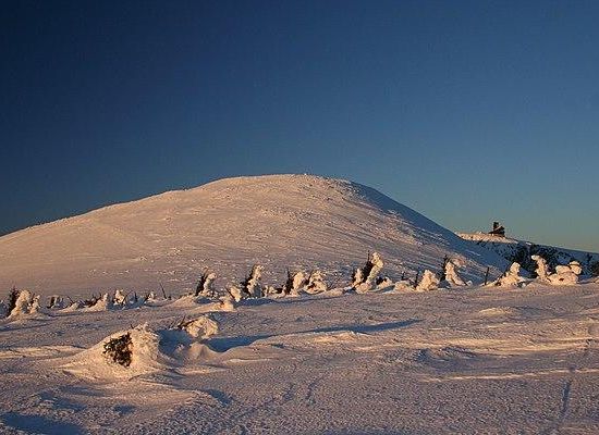 Das Hohe Rad ist mit 1509 m nach Schneekoppe, Luční hora und Studniční hora der vierthöchste Berg des Riesengebirges und die höchste Erhebung im westlichen Teil des Gebirges. Die Staatsgrenze zwischen Polen und Tschechien verläuft über den Gipfel.Direkt am Gipfel steht das weithin sichtbare, verfallene Denkmal von Kaiser Wilhelm I. Auf der nordwestlichen Schulter, unmittelbar am Rand der Schneegruben befindet sich die markante ehemalige Schneegrubenbaude , die heute als Fernseh- und Rundfunksender sowie als meteorologische Station dient. Direkt unter der Südflanke liegt die Martinsbaude , eine der traditionellen Bergbauden des Riesengebirges. Westlich – in einer Entfernung von etwa zwei Kilometern – befindet sich in einer weiten Hochmoorfläche das Quellgebiet der Elbe.