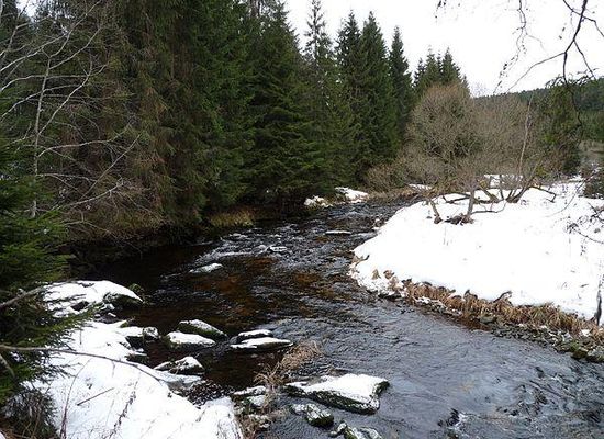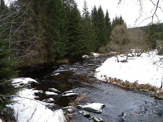 Die Kalte Moldau entsteht im Bayerischen Wald nördlich des Bramandlberges und des Hirschberges durch den Zusammenfluss von linkem Weberaubach und rechtem Rothbach. Der Bachlauf führt später vorbei an Haidmühle und der Wüstung Na Spálenci in östliche Richtung; zwischen den Einmündungen des Moorbaches und des Ruttenbaches markiert er auf ca. zwei Kilometern die deutsch-tschechische Grenze. Danach fließt die Kalte Moldau auf tschechisches Gebiet, wo sie bei Nové Údolí nordöstliche Richtung annimmt. Die Bergmoorwiesen hinter der Grenze sind seit 1985 auf einer Fläche von 101 ha als Naturdenkmal Spálený luh unter Schutz gestellt. Der weitere Lauf führt vorbei an den Lorenzbergen und dem Stožec und der Wüstung Pasta durch Stožec und Černý Kříž . Der Unterlauf der Kalten Moldau führt durch das Naturdenkmal Vltavský luh . Bei Chlum , einem Ortsteil der Stadt Volary , vereinigt sie sich nach 24 Kilometern im Moor Mrtvý luh mit der Teplá Vltava/Warmen Moldau zur Vltava/Moldau.