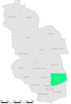 Der Stadtteil Bulmke-Hüllen liegt im Stadtbezirk Gelsenkirchen-Mitte nordöstlich der Gelsenkirchener Innenstadt . Im Westen grenzt Bulmke-Hüllen weiter an Schalke, im Norden an Gelsenkirchen-Bismarck. Im Osten verläuft die Grenze zum Herner Stadtteil Röhlinghausen und im Süden liegt Gelsenkirchen-Ückendorf.