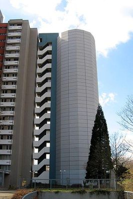 Die ungewöhnliche, rund 50 Meter hohe Konstruktion befindet sich in nur 40 cm Abstand zu einem 20-stöckigen Hochhaus und erweckt dadurch den Eindruck, als sei sie ein Teil von diesem. Der Wasserturm verfügt über zwei getrennte, übereinander liegende Wasserkammern mit einem Volumen von oben 1.230 m³ und unten 2.100 m³.