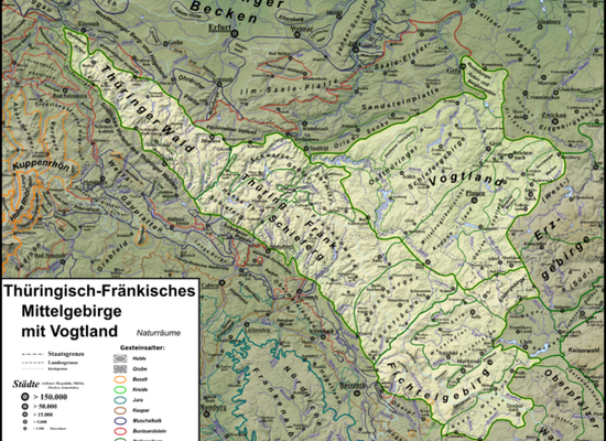 Die naturräumliche Gliederung des Thüringisch-Fränkischen Mittelgebirges basiert auf einer deutschlandweiten Gliederung in Haupteinheitengruppen und Haupteinheiten des Instituts für Landeskunde in den 1950er Jahren im mehrteiligen Handbuch der naturräumlichen Gliederung Deutschlands, das der Beschreibung einer Haupteinheit im Durchschnitt zwei Buchseiten widmete. Anders als für fast alle anderen Regionen Deutschlands ist die feinere Gliederung des Instituts mit Karten im Maßstab 1:200.000 für große Teile dieses Mittelgebirges nie zustande gekommen, da aufgrund der deutschen Teilung auf ostdeutsche Kartenblätter schließlich verzichtet wurde ) und im ansonsten komplett kartierten Westteil Deutschlands ausgerechnet die bayerisch-fränkischen Landesteile nur zu kleinen Anteilen fertiggestellt wurden und Blatt 154/155 Bayreuth, die das Fichtelgebirge und große Teile des Frankenwaldes abgehandelt hätten, jedoch nie erschienen sind). So existieren lediglich auf Blatt 126 Fulda eine Detailaufnahme vom Nordwesten des Thüringer Waldes und im spät erschienenen Blatt 141 Coburg eine vom südlichen Schiefergebirge und vom nordwestlichen Frankenwald.