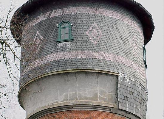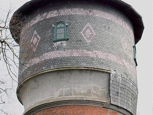 Der 1902 errichtete Wasserturm ist ein im Grundriss kreisrunder Bau mit einer Höhe von 35,8 m. Der Schaft ist mit Backsteinen gemauert. Im Behälterbereich ist der Turm nur wenig breiter. Das hängt damit zusammen, dass kein Intze-Behälter, sondern ein Barkhausen-Behälter eingesetzt wurde. Dieser Behälter mit halbkugelförmigem Behälterboden benötigt keinen Stützring mehr und stellt daher einen Fortschritt dar.