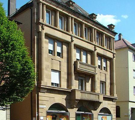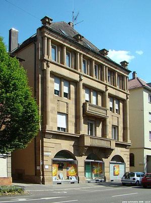 Das Gebäude wurde für Friedrich Mößner in den Jahren 1907/1908 von Emil Beutinger und Adolf Steiner gebaut. Die Fassade ist ganz in Sandstein gehalten und wird von vier Säulen in Kolossalordnung gegliedert. Die Säulen haben als oberen Abschluss jeweils musizierende Putten und tragen ein Gurt- bzw. Stockwerksgesims. Auf diesem Gesims stehen Zwillingssäulen, die das abschließende Dachgesims tragen.