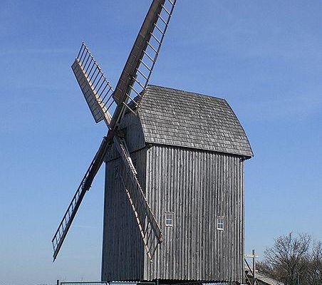 Die Bockwindmühle ist mit Segelflügeln ausgestattet und windgängig. Von der Ausstattung sind noch der Mahlgang, der Aufzug und der Walzenstuhl erhalten.