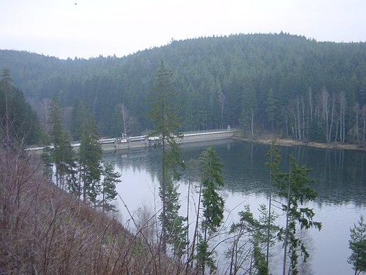 Das Absperrbauwerk des Oberbeckens ist eine gerade Gewichtsstaumauer aus Gussbeton. Sie wurde 1933 in nur vier Monaten errichtet. Am 2. Dezember 1933 wurde sie erstmals eingestaut. 1954 bis 1955 wurde die Mauer um 3 m auf 16,1 m erhöht und dabei auch luftseitig verstärkt. Sie ist auf Tonschiefer gegründet. Als Hochwasserentlastung wurde auf jeder Seite neben dem Überfall ein Heber gebaut.