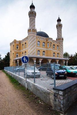 Die Moschee aus gelbem und weißem Backstein vereint sowohl orientalische Stilelemente als auch Anklänge an die norddeutsche Backsteinarchitektur. Der Bau hat eine Kuppel mit acht Metern Durchmesser und zwei Minarette mit je 26 Metern Höhe. Der Gebetsraum fasst 200 Gläubige, die Frauen-Empore weitere 100.