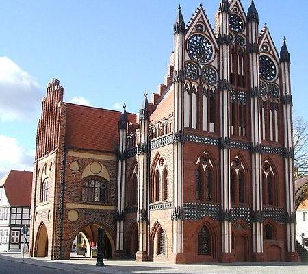 Ältester Teil des Gebäudes ist der Ostflügel, der 1430 wahrscheinlich von dem zu dieser Zeit in der Mark Brandenburg und in Pommern wirkenden Baumeister Hinrich Brunsberg errichtet wurde. Bemerkenswert ist die 24 Meter hohe aus Backstein gemauerte Schauwand. Hinter ihr befindet sich der prächtige Rathausfestsaal. 1480 folgte der Bau der Gerichtslaube und der darüber befindlichen Ratsstube, die heute als Trauzimmer genutzt wird. Das Bauwerk war einst eine Erweiterung des eigentlichen Rathauses des 14. Jahrhunderts, das vermutlich in Fachwerk ausgeführt war und 1617 abbrannte. Von diesem Bauwerk sind an der Langen Straße gewölbte Kellerräume des 14./15. Jahrhunderts erhalten geblieben.