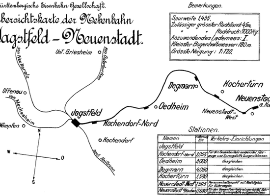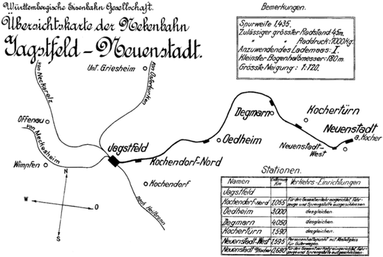 Mit einer Länge von 22,6 km war sie die längste Strecke der WEG. Sie wurde in zwei Etappen eröffnet: Am 15. September 1907 erreichte die Bahn Neuenstadt, am 1. August 1913 wurde sie bis Ohrnberg verlängert. Nach der Einstellung des Betriebs zum 27. Dezember 1993 scheiterte die zunächst geplante Integration in das Netz der Heilbronner Stadtbahn. Die Trasse ist nun als Radwanderweg befahrbar.