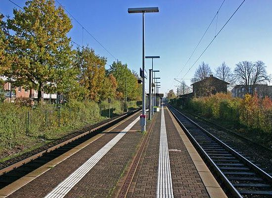 Der Bahnhof liegt im Norden der Innenstadt von Korschenbroich, erreichbar über die Hindenburgstraße. Er wird durch die hier haltende S-Bahn-Linie S 8 der S-Bahn Rhein-Ruhr und die Buslinien zum Verkehrsknoten für die Korschenbroicher Stadt- und Ortsteile Raderbroich, Herrenshoff, Trietenbroich, Neersbroich und Pesch. Die Buslinien führen nach Giesenkirchen, Rheydt, Wickrath und Mönchengladbach Hbf. Im Norden schließt die Herrenshoffer Straße an, die durch eine reine Wohngegend führt. Im Süden befindet sich eine Mischbebauung aus Gewerbe und Wohnen; in unmittelbarer Nähe zum Bahnhof entsteht derzeit ein großes Seniorenzentrum, in dem ein Altenpflegeheim und Betreutes Wohnen geplant sind.