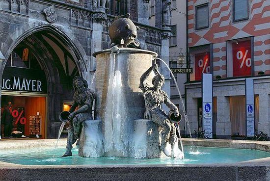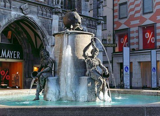 Der Fischbrunnen steht vor dem Haupteingang des Neuen Rathauses auf dem Marienplatz in der Altstadt Münchens.