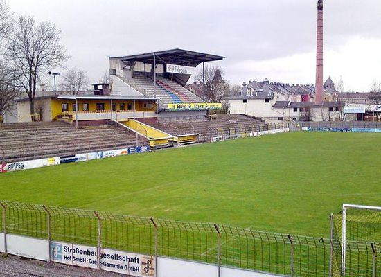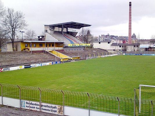 Am Ostrand Hofs im Viertel Fabrikvorstadt gelegen, entstand das Stadion auf einem Gelände, das der FC Bayern Hof 1913 pachtete und 1930 kaufte. Der zu Beginn noch Britannia Hof genannte Verein erweiterte das Stadion Grüne Au in den nächsten Jahren immer wieder. 1949 wurde eine 72 Meter lange, überdachte Sitzplatztribüne in Holzbauweise auf der Nordseite errichtet und 1959 das Stadion nochmals erweitert. 1969 entstand die Südtribüne, die sogenannte Neue Tribüne, die lange über kein Dach verfügte.