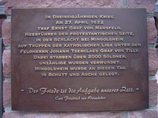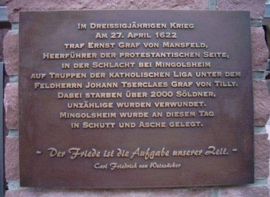 Die Schlacht bei Mingolsheim fand am 27. April 1622 zwischen der Hauptmacht des Heeres der katholischen Liga unter persönlicher Führung Tillys und dem Heer des geächteten Pfalzgrafen Friedrich V. unter Führung Mansfelds statt. Der eigentliche Kampfplatz war am Ohrenberg, einem leicht ansteigenden Hügel südlich von Mingolsheim. Das Dorf Mingolsheim wurde zu Beginn des Treffens von pfälzisch-mansfeldischen Truppen angezündet und brannte größtenteils nieder.