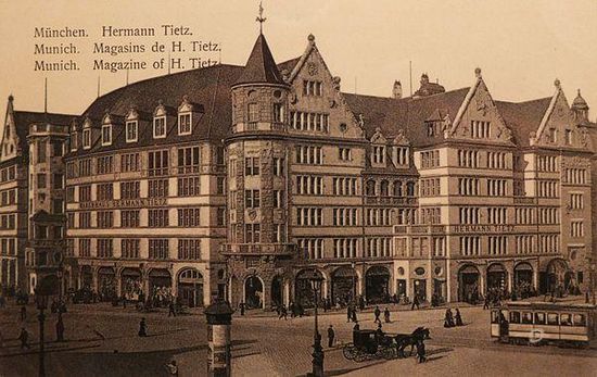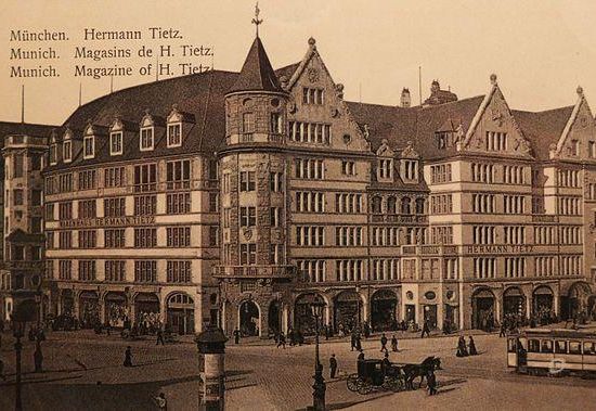 Das traditionsreiche, denkmalgeschützte Kaufhaus wurde in den Jahren 1904 bis 1905 nach Entwürfen des Münchener Architekten Max Littmann für die Warenhauskette Hermann Tietz gegenüber dem Hauptbahnhof errichtet und am 14. März 1905 eröffnet. In der Gestaltung des Baukörpers bediente sich Littmann, dem historisierenden Zeitgeschmack folgend, Elementen der deutschen Renaissance. Das ehemalige Warenhaus Tietz ist ein fünfgeschossiger Walmdachbau mit Vorsprüngen, Treppentürmen, Giebeln und Gauben. Es wurde in Eisenbeton-Skelettbaubauweise mit reduziert historisierenden Fassadengestaltungen, teils mit Muschelkalk erbaut. Der plastische Fassadendekor stammt von Julius Seidler, Jakob Bradl und Fidel Enderle.