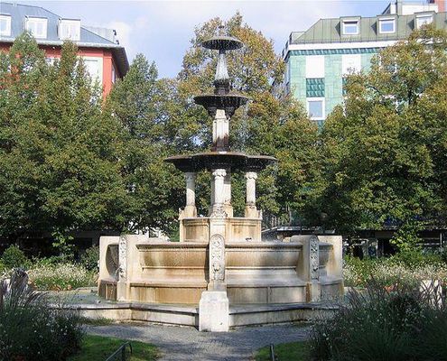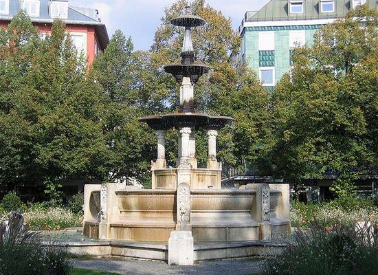 Der Glaspalast-Brunnen in München-Haidhausen auf dem Weißenburger Platz ist im Stil von König Maximilian II. 1853 von August von Voit geschaffen.