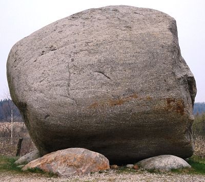 Der Stein wurde 1983 in der benachbarten Kiesgrube gefunden. 1990 wurde er aus der Kiesgrube geborgen und wird seitdem, zusammen mit zahlreichen anderen Findlingen, in einem geologischen Findlingsgarten ausgestellt. Der Findling besteht aus grobkörnigem Granit mit Kristallen von grauem Feldspat, blauem Quarz und schwarzem Glimmer. Daneben enthält er bis zu 20 Zentimeter große Stücke aus anderen Gesteinen, unter anderem Hornblendgneis und Amphibolit.