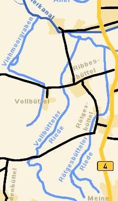 Der Bach entspringt südöstlich von Rötgesbüttel in einem Laubwald zwischen den Orten Rethen und Rötgesbüttel. Der Bach fließt von seiner Quelle in nördlicher Richtung an Rötgesbüttel vorbei. Am Nordrand des Ortes nimmt er geklärte Abwässer aus den lokalen Teichanlagen auf. In seinem Lauf folgt der Bach heute in etwa dem Streckenverlauf der Bundesstraße 4 und der Bahnstrecke Braunschweig–Wieren zwischen Meine und Ausbüttel. Hier mündet der Bach in die „alte Hehlenriede“, das ehemalige Flussbett der Hehlenriede. Durch den Bau des Allerkanals wurden die Bachunterläufe verändert, so dass Teile der früheren Hehlenriede jetzt nur noch als Unterlauf anderer Bäche vorhanden sind. Über die „alte Hehlenriede“ mündet die Rötgesbütteler Riede in den Allerkanal.