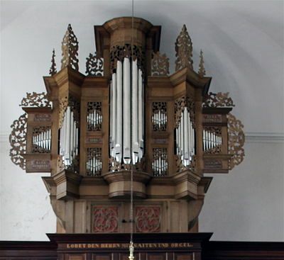1694 erfolgte der Neubau durch Grotian. Technisch, optisch und klanglich lehnte sich Grotian stark an den Orgelbauer Joachim Kayser an. Beide konnten in Ostfriesland trotz des Konkurrenzdrucks vonseiten Arp Schnitgers ihre Eigenständigkeit bewahren. 1772 wurde die Orgel von Dirk Lohman renoviert. Aus dieser Zeit stammt die schöne Inschrift hinter dem Notenpult: Eedo Siewerts / Organist en Schoolmeester. Die Reparatur durch H. F. Thielke führte dazu, dass sich der Zustand des Instruments eher verschlechtert, wie der Orgelbauer Arnold Rohlfs 1843 in einem Beschwerdebrief an das Konsistorium darlegte. Gerd Sieben Janssen führte 1854 einen Orgelumbau durch, ersetzte zwei Register im Oberwerk und die Klaviaturen und erweiterte die fehlenden Basstöne. 1892 reparierte Johann Diepenbrock die Orgel. Die originale Trompete wurde 1930 durch Max Maucher ersetzt. Jürgen Ahrend stellte 1991 den Zustand von 1694 wieder her. Die Pfeifen im Prospekt wurden mit Zinnfolie belegt, das originale Eichengehäuse von der späteren weißen Farbgebung befreit und die Klaviaturen mit kurzer Oktave sowie die Keilbalganlage rekonstruiert. Zudem wurde eine modifiziert mitteltönige Temperatur angelegt. Die Windlade ist original erhalten.