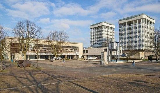 Das Rathaus ist ein Profangebäude am Creiler Platz 1 in Marl, im Kreis Recklinghausen . Es besteht aus einem Verwaltungstrakt, dem Sitzungssaal und den beiden charakteristischen Dezernatstürmen.
