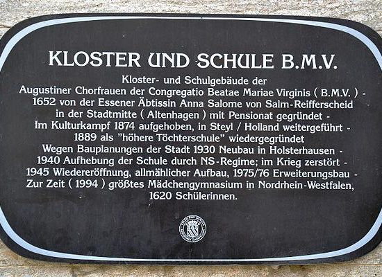 Der Orden der Augustiner-Chorfrauen wurde 1597 in Lothringen gegründet und hat als Apostolat die Mädchenerziehung. Von Lothringen aus gründeten sie in Frankreich und in vielen anderen Ländern Klöster, so auch in Deutschland. 1652 gingen drei Schwestern auf Anfrage der damaligen Fürstäbtissin Anna Salome von Salm-Reifferscheidt aus Münster nach Essen und gründeten dort in der Innenstadt das Kloster und die Schule B.M.V. 1931 zogen die Schwestern und die Schulgemeinschaft wegen Platzmangels aufgrund der stets wachsenden Schülerinnenzahl nach Essen-Holsterhausen, wo die Schule bis heute als Mädchengymnasium besteht.