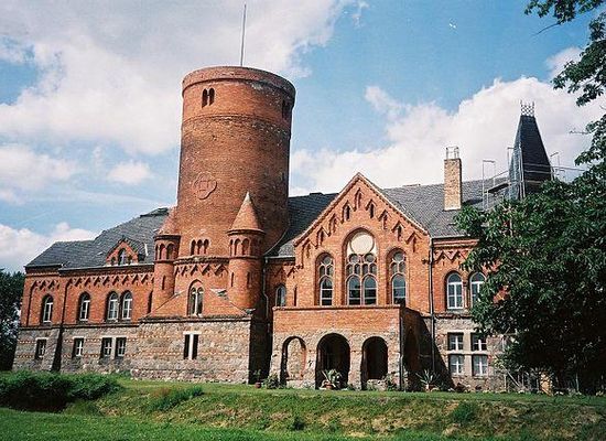 Die Niederungsburg und Wasserburg wurde 1355 erstmals urkundlich als „castro Mügghenborg“ erwähnt. Das Wort „Mügge“ steht dabei für eine Landzunge in einer feuchten Niederung. Zu dieser Zeit war die Burg Stammsitz der pommerschen Adelsfamilie von Nienkerken . 1434 wurde ein Teil der Anlage bei einem Konflikt mit der Stadt Anklam zerstört, nur der 28 Meter hohe Fangelturm blieb erhalten. Um ihn herum wurde in den Jahren 1889 bis 1891 das heutige Herrenhaus im neugotischen Stil errichtet.