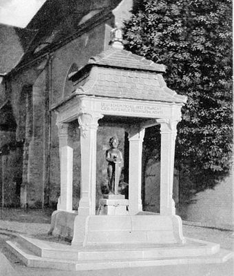 1909 beauftragten der Liebenwerdaer Kriegerverein und Curt Ziehlke, Redakteur des Liebenwerdaer Kreisblattes, den Architekten Karl Jost mit dem Entwurf einer Brunnenfigur. Man wollte ein Denkmal, das in seiner Form von den in dieser Zeit üblichen Gedenkstätten für Kriegstote abwich. Der Bildhauer Loew aus Elberfeld modellierte die Bronzefigur eines 1,35 Meter großen „Deutschen Michels“ in Form eines frischen, lebenskräftigen, stämmigen jungen Mannes der sich auf sein Schwert stützt und dem man ansehen sollte, „daß er es vermag, auf eigenen Füßen zu stehen.“ Sie sollte den neuen Deutschen Michel darstellen, „dem die viehlgeschmähte Schlafmützigkeit des alten Michels völlig fremd ist.“ Gegossen wurde sie in der Bronzegießerei der Lauchhammer AG. Der Dresdner Bildhauer G. R. König übernahm die Bildhauerarbeiten. Die Kalksteinlieferungen, sowie die Steinmetzarbeiten am mit einem Mansarddach ausgeführten Brunnenhaus leistete die Firma J. Röder aus Randersacker bei Würzburg. Ein Wasserspiel wurde an den vier Seiten bis zur Höhe des Sockels geführt und Ornamente an den oberen Abschlüssen der Pfeiler stellten die verbündeten Armeen von Preußen, Bayern, Sachsen und Württemberg im Kampf gegen Napoléon III. in Form von Soldatenhelmen dar. Die Dachspitze des Denkmals wurde als kupferne Kaiserkrone ausgeführt. Das Bauwerk hatte eine Höhe von 5,25 m und der äußerste Abstand der untersten Stufen betrug 4,5 m.