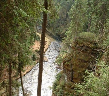 Die Kirnitzsch, früher und heute noch dialektal auch Kirnscht oder Kirnsch genannt, entspringt im Lausitzer Bergland im östlichen Böhmischen Niederland westlich des Dorfes Studánka auf einer Höhe von 490 Metern und durchfließt auf ihrem Lauf nach Westen die Stadt Krásná Lípa . Hinter dem Dorf Kyjov bahnt sie sich ihren Weg in engen Schluchten durch die Sandsteinfelsen der Böhmischen Schweiz; das wildromantische Tal ist auch als Khaatal bekannt.