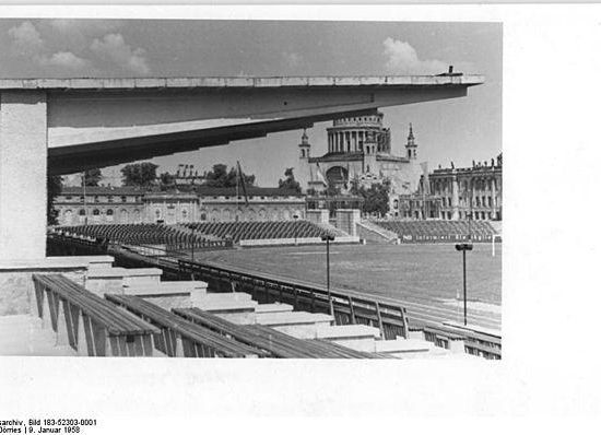Im Zweiten Weltkrieg richtete der Luftangriff auf Potsdam in der Innenstadt ausgedehnte Zerstörungen an. Dabei erlitten der Lustgarten und das benachbarte Potsdamer Stadtschloss schwerste Beschädigungen. In der nach dem Krieg einsetzenden Diskussion über die Frage „Abriss oder Wiederaufbau?“ traten Anhänger der Sozialistischen Einheitspartei Deutschlands für den Abriss ein. Während der Auseinandersetzung leitete die SED-gesteuerte Deutsche Volkspolizei im Jahr 1948 mit der Errichtung des Ernst-Thälmann-Stadions den „Anfang vom Ende des Schlossareals“ ein. Ab Oktober 1948 errichteten Volkspolizisten, freiwillige Helfer und Mitglieder der SG Volkspolizei Potsdam das Stadion auf der Fläche des zerstörten Lustgartens. Trümmer der Innenstadt Potsdams bildeten die Grundlage für Zuschauerwälle und Aufbauten. Namenspatron war Ernst Thälmann, der 1944 im KZ Buchenwald ermordete Vorsitzende der Kommunistischen Partei Deutschlands . Gäste der feierlichen Eröffnung am 3. Juli 1949 waren der Nachfolger Thälmanns im KPD-Vorsitz, der SED-Vorsitzende Wilhelm Pieck, der später Präsident der DDR wurde, und Rosa Thälmann, die Witwe Thälmanns. Die Anlage soll der erste größere Stadionneubau nach Beendigung des Krieges in Deutschland gewesen sein. Zur Eröffnung kamen 20.000 Zuschauer. Die Sportanlage verfügte über Zuschauertribünen, technische Einrichtungen, einen Rasenplatz und eine 400-Meter-Aschenbahn. Sie hatte ein Fassungsvermögen von 15.000 Personen.