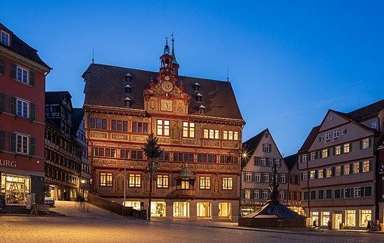 Das Tübinger Rathaus wurde ab 1435 erbaut und in mehreren Phasen erweitert und renoviert. Es diente ungefähr von 1471 bis 1805 als Sitz des Hofgerichts des Landes Württemberg. Neben Gerechtigkeitsbildern, Friesen und Sgraffito-Bemalungen enthält die Fassade eine astronomische Uhr. Das Gebäude hat eine Länge von ca. 20 Metern, ist ca. 15 Meter breit und hat bis zur Traufe eine Höhe von ca. 20, bis zum First von ca. 30 Metern.