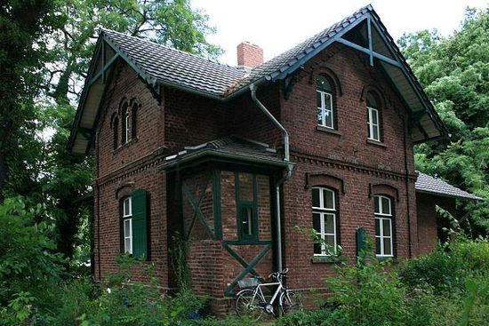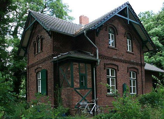 Im Ortsteil Volksgarten steht innerhalb eines größeren Gartengeländes freistehender zweigeschossiger Backsteinbau auf winkelförmig verschachteltem Grundriss. Jeweils differierende Gestaltung und Gliederung der einzelnen Fassadenfronten. Als gleichwertige Hauptfassaden ausgebildet sind die giebelständige Süd-, Nord- und Westfassade des Hauses. Die Giebel sind jeweils als Schwebegiebel in einer Holzkonstruktion ausgeführt. Als gemeinsame Horizontalgliederung ein umlaufendes Klötzchengesims; als Vertikalbetonung Eckverstärkungen in Lisenenform. Die Wandfläche der Südfassade öffnen in jedem Geschoss zwei axial angeordnete Fenster.