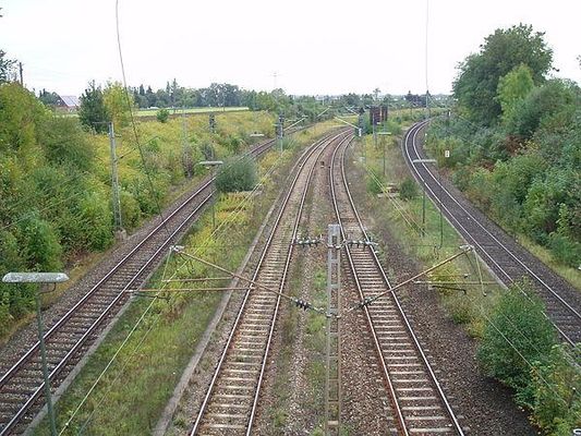 Der Bahnhof ist als Durchgangsbahnhof angelegt und hat vier Gleise und zwei Mittelbahnsteige. Die beiden mittleren Gleise kommen von Gleis 6 beziehungsweise führen zu Gleis 7 des Bahnhofes Augsburg-Oberhausen , Richtung Westen erreichte man früher Dinkelscherben, Markt Wald, Welden und Ulm. Die Weiche, die zur Weldenbahn führte, ist allerdings ausgebaut und die Strecke nach Welden stillgelegt sowie nahezu vollständig zurückgebaut. Über diese beiden mittleren Gleise fahren nur Regional- und Güterzüge.
