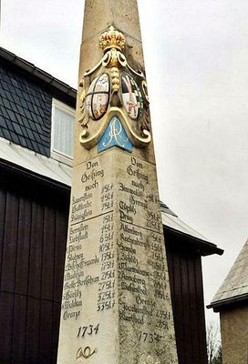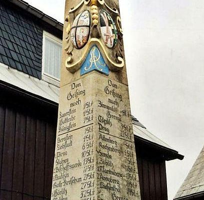 Ursprünglich sollte sowohl in den beiden benachbarten Städten Alt-Geising und Neu-Geising je eine Distanzsäule errichtet werden. Nach einem Gesuch beider Städte einigte man sich 1728 auf die Setzung einer Säule auf dem Altmarkt in Neu-Geising. Die Säule wurde von Ulrich Schindler in Pirna gefertigt und Ende 1734 aufgestellt. Nachdem die Säule 1857 auf den Neumarkt versetzt werden sollte, kam es auf Kostengründen zum völligen Abbruch und zum Verkauf der Steine als Baumaterial. Der Sockel wurde vermutlich beim Bau des Kriegerdenkmals von 1870/71 verwendet. Anlässlich der 525-Jahr-Feier von Geising wurde eine Kopie der Distanzsäule nach den Vorgaben der Forschungsgruppe Kursächsische Postmeilensäulen angefertigt und am 12. Juli 1987 feierlich vor der damaligen HO-Gaststätte Geisinghof enthüllt.